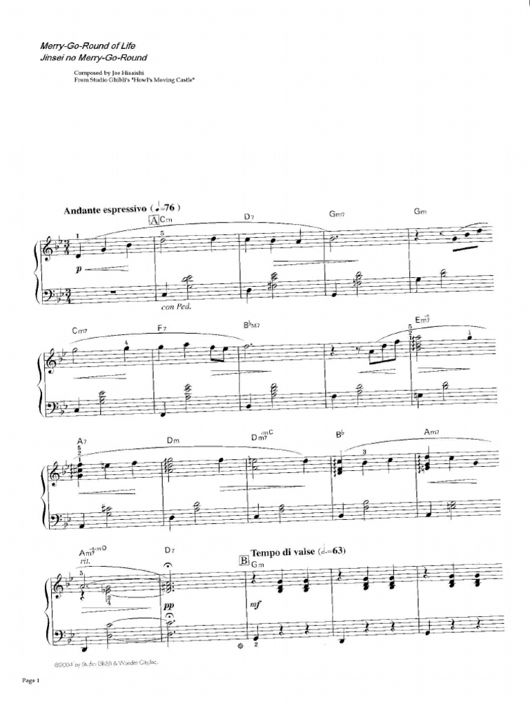2 followers 1 score Piano score for the song from the Studio Ghibli film Howls Moving Castle. Howls Moving Castle OST. We give you 5 pages partial preview of Joe Hisaishi Merry Go Round Of Life Piano Solo music sheet that you can try for free.